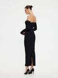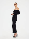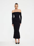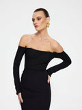 Off shoulder long sleeve dress with boning at the waist for a fitted silhouette. Slight ruching along the neckline.