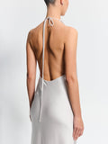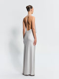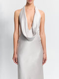 Astoria is pure elegance in motion. Crafted in our luxurious satin, Astoria features a beautiful deep cowl neckline that falls into a clean, floor-length silhouette. The embodiment of restraint, Astoria is cut with a low back and adjustable straps to tie the neckline. A gown for grand receptions, intimate weddings, or formal moments where timelessness is key.