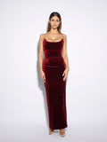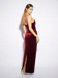Our Koi Gown is made from plush stretch velvet and cut for a close fit. This strapless style has strategic ruching throughout the lower abdomen area for a flattering effect. Wear it to a cocktail party with sky-high pumps and a bold red lip.