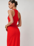 The 'Eiza' gown calls to mind minimalist styles from the '90s. It's made from lustrous cherry red stretch crepe and has an almond shaped neckline. Fits true to size. Take your normal size