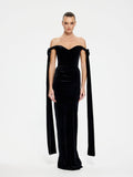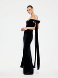 Off shoulder neckline with delicate velvet bow straps on both sides of the body, made from our luxurious velvet fabrication. A statement gown for your next special event.