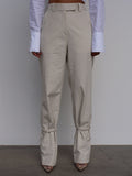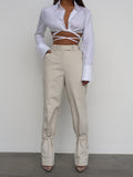 Cut from mid-weight stretch cotton drill, they sit mid waisted and have straight legs, the ankle strap detail offers a modern utilitarian edge.