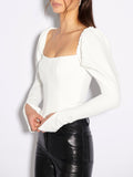 There's a sculptural quality to our 'Abyss' top that's elegant and striking. Paneled from stretch crepe and lined in jersey, it has puff sleeves that contrast the fitted bodice. The tapered neckline frames pendants artfully.