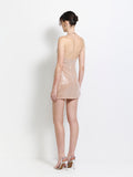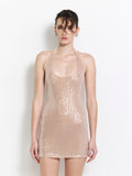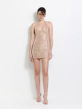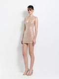 Defined by sculpted elegance and luminous femininity, we introduce the Dakota Mini. Crafted in delicate blush sequins, this mini dress features a halter-inspired neckline that frames the shoulders and elongates the silhouette. Precision tailoring sculpts the body, highlighting curves while maintaining effortless poise. Perfect for cocktail evenings, celebrations, or nights when you want to shine, Dakota Mini pairs beautifully with statement heels or delicate accessories to complete a look of modern sophistication.