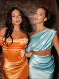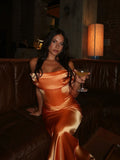 Satin maxi length skirt with an off shoulder bodice in Tangerine.