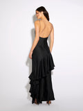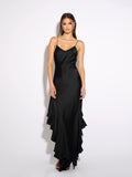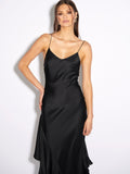 Our radiant 'Olivia' gown may be simple, but it'll still make a big impact at any occasion. It's cut from lightweight satin that elegantly skims the contours of your body before falling to a floor-sweeping hem thats lined with a ruffle detail. The modest V-neckline is framed by dainty shoulder straps; wear yours with a statement earring and micro clutch.