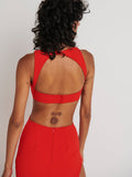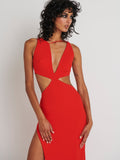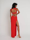 Our Eniko Gown is defined by the sharp V neckline and cutouts at the waist. Perfect for glamorous evening events, it's made from stretch scuba crepe that falls to a thigh-grazing split. Style yours with barely there metallic heels.