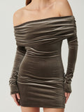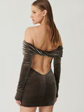 The Gwen Mini is designed with an off-the-shoulder neckline that wraps around your frame. The gathered panel creates a draped effect that twists in the back. Made from a luxe velvet that skims your frame.