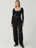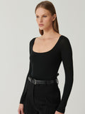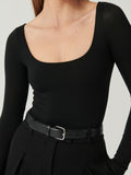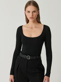 Discover the ultimate wardrobe staple with our Black Long-Sleeve Scoop Neck Bodysuit. Designed for the modern woman, this bodysuit seamlessly blends elegance and comfort, making it an essential addition to your collection. The flattering scoop neck and sleek, fitted silhouette ensure you always look your best, whether you're heading to the office or out for an evening event.