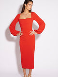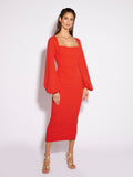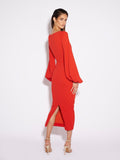 Our Mariposa dress has a flattering bustier-inspired bodice with a square neckline that peeks out from underneath the draped detailing and features a puff sleeve. It's cut from stretch crepe and has a slim fit with a seamed waist and back split for ease of movement. Style it with embellished sandals.