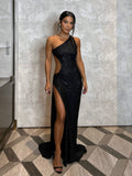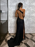 Our 'Portia' dress is embellished with scores of light-catching matte black sequins. The plunging back recalls Hollywood bombshell glamour. Wear yours with dewy, natural-looking makeup and barely there heels.