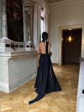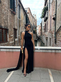 With a sweeping one shoulder neckline and a tie that is elegantly draped over your bare shoulder cascading to the floor.