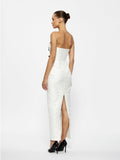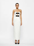 Effortlessly graceful, we introduce the Kiera Dress. Featuring a strapless cut with a plunging neckline, detailed with intricate patterning and accents across the body. Finishing with a flirty and feminine finish with two bows at the bodice. This gown moves with elegance and ease, made with a gorgeous Brocade for understated elegance. Perfect for special celebrations and event dressing.