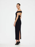 Off shoulder silhouette with an open back, featuring an elegant strap detailing and delicate ruching through the hips.