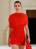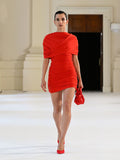 The perfect mini dress for the warmer seasons ahead. Featuring sculptural ruching across the body with a detailed drape across the shoulders. Made with our signature soft jersey fabrication. This mini is made for a short cut.