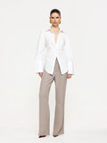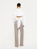 A classic white shirt with a modern twist, featuring an open back and tie detail. Our Brooklyn Shirt is tailored from a crisp cotton blend for the perfect blend of comfort and effortless style. For a timeless look, wear with our classic tailored pants and a kitten heel.