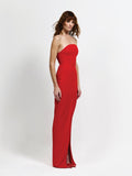 Introducing the Lani gown, a striking blend of statement dressing and feminine allure. Lani features a beautiful curved neckline that seamlessly cascades into a floor length gown. Perfectly cinched at the waist, Lani stands out with a daring front split for a touch of added sensuality and confident dressing. Crafted for the woman who demands attention through timeless luxury.