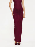 Mesh maxi skirt featuring detailed ruching across the body, can be worn to the side as well. Designed to be worn with our matching Parker Bodysuit. Please note that any distortions to the fabric in the imagery is due to our studio lighting. Limited quantities.