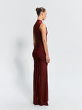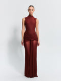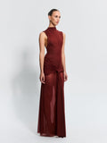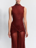 Roza features a beautiful high neckline design with a fitted silhouette, featuring a twisted drape gathering down the body. Roza features a double layer bodysuit underneath, detailed gathering across the hips. This piece is made to be slightly sheer.