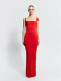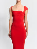 Winslie is a gown of contemporary poise. In our vivid Rio, Winslie embraces vibrancy without excess, flowing beautifully with ease in our signature soft jersey. Featuring an asymmetrical neckline , balancing a strappy detailing with a capped sleeve, Winslie belongs to nights of celebration — from rooftop dinners to evening receptions abroad.